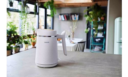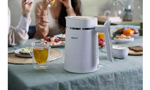 De 100% biobased plastics** zijn gemaakt van biologische en hernieuwbare bronnen, zoals zonnebloemolie. Gebruikte olie die bij het koken achterblijft, wordt verzameld en gerecycled via een milieuvriendelijk proces om deze geschikt te maken voor contact met voedsel. De waterkoker heeft een meervoudig veiligheidssysteem om te voorkomen dat deze ook zonder water werkt.