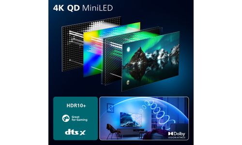 Dankzij de combinatie van MiniLED-achtergrondverlichting en Quantum Dot technologie profiteer je van een breder kleurenpalet, diepe zwarttinten en een ongekend contrast. Of je nu films kijkt, sportwedstrijden volgt of gamet, elk beeld is realistisch en krachtig.