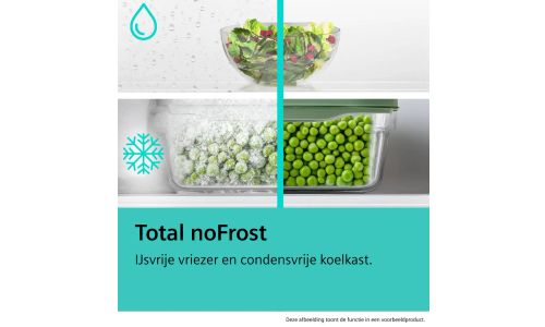 Dankzij de Total noFrost-technologie hoef je je geen zorgen meer te maken over het ontdooien van je vriezer. Total noFrost onttrekt vocht uit de lucht, waardoor er geen ijsvorming optreedt op de wanden en je etenswaren. Dit geldt ook voor de koelkast. Vocht en ijs zetten niet meer af op de achterwand, zodat je boodschappen goed bewaard blijven. Dit bespaart je niet alleen de moeite van het ontdooien, maar maakt je apparaat ook energiezuiniger.