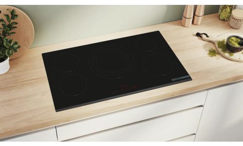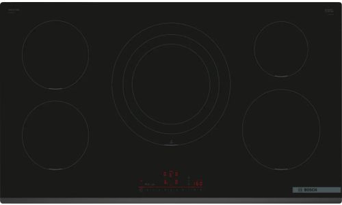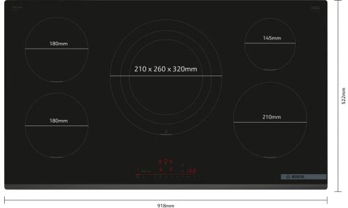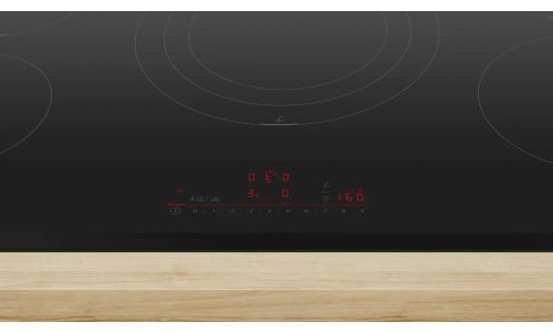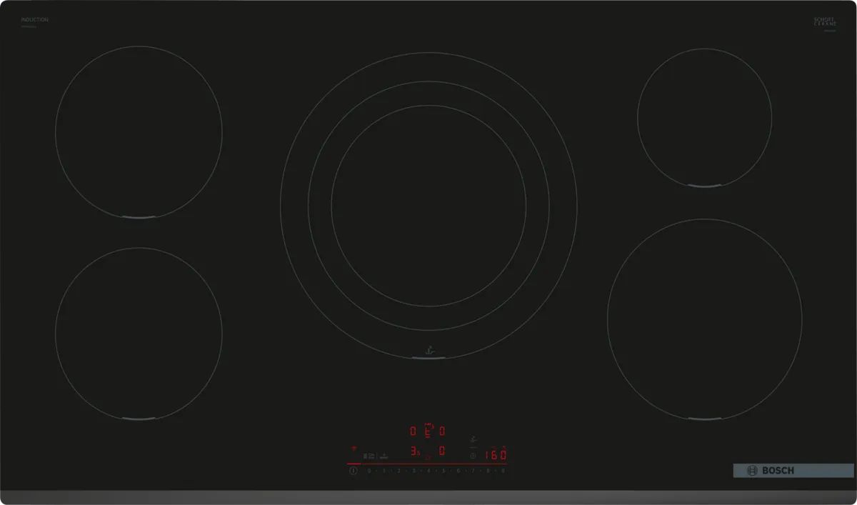 Kookplaat Serie 6 Inductie 90 cm, PowerInductie, 5 zones, driekrings PowerZone 4,4 kW, DirectSelect met 17 vermogensstanden, PerfectFry Plus, Power Boost alle zones, 2 timers (alternative), Home Connect - Hood Control, facet voor, 11.100 W Zonder kader, facet vooraan
