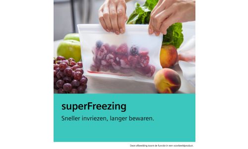 Heb je je wekelijkse boodschappen gedaan, maar wil je voorkomen dat de temperatuur van reeds ingevroren producten omhoog gaat bij het inladen van nieuwe diepvriesproducten? Met superFreezing koelt het diepvriesgedeelte af tot de miminumtemperatuur, zodat nieuwe etenswaren snel invriezen en reeds bevroren producten bevroren blijven. Stel superFreezing 4-6 uur voordat je thuiskomt in. Met de Home Connect-app verlaagt superFreezing de temperatuur tijdelijk terwijl je nog onderweg bent. Dat is perfect invriezen in een handomdraai.